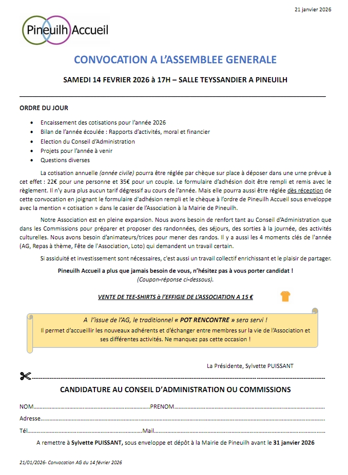 L’Assemblée Générale se tiendra le 14 février 2026 à 17 heures à la Salle Teyssandier à Pineuilh.